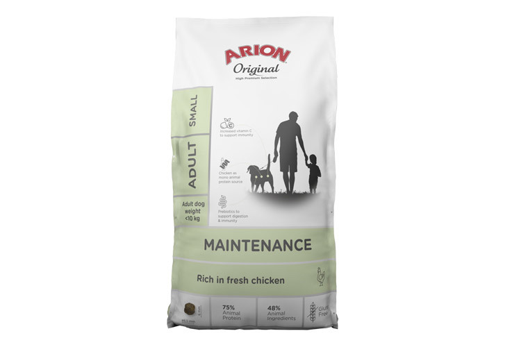 Arion Original Maintenance Small es un alimento completo para perros adultos. Esta receta a base de pollo y sin gluten contiene prebióticos, antioxidantes y un elevado aporte de vitamina C para fortalecer el sistema inmunitario de tu perro.