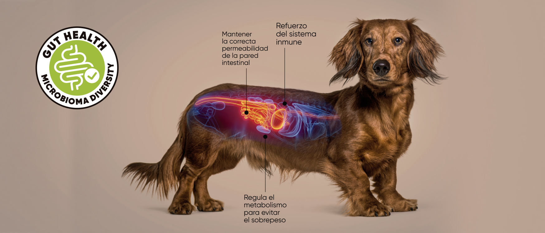 Un microbioma intestinal sano se asocia con una mejor salud general del perro: mejor digestión, menor riesgo de enfermedades, mejor control de peso, y favorece la longevidad.