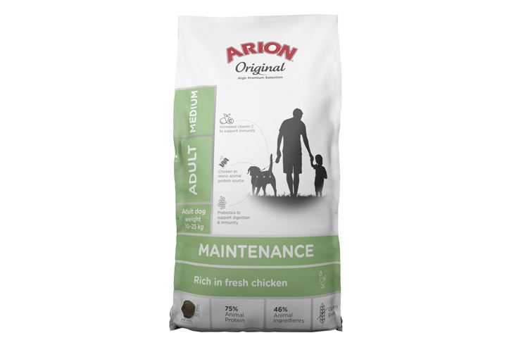 Arion Original Maintenance Medium es un alimento completo para perros adultos. Esta receta a base de pollo y sin gluten contiene prebióticos, antioxidantes y un elevado aporte de vitamina C para fortalecer el sistema inmunitario de tu perro.