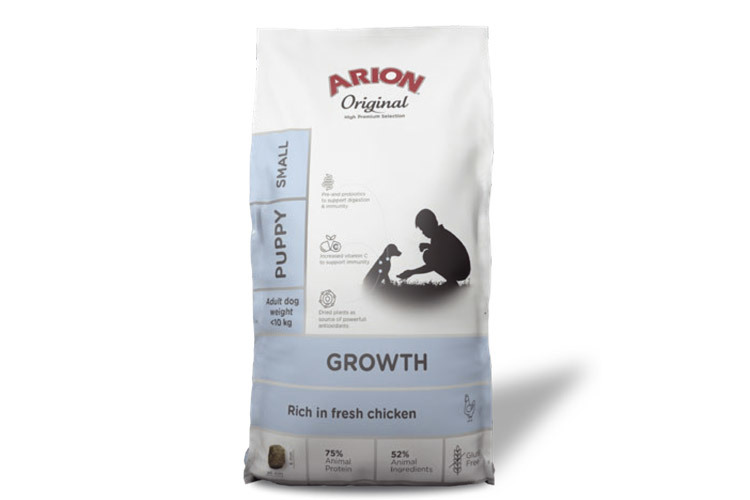 Arion Original Growth Chicken Small es un alimento completo para cachorros. Esta receta sin gluten, a base de pollo altamente digestible, contiene prebióticos y probióticos y niveles adecuados de vitaminas y minerales para proporcionar un enfoque multifuncional para la alimentación de tu cachorro en crecimiento.